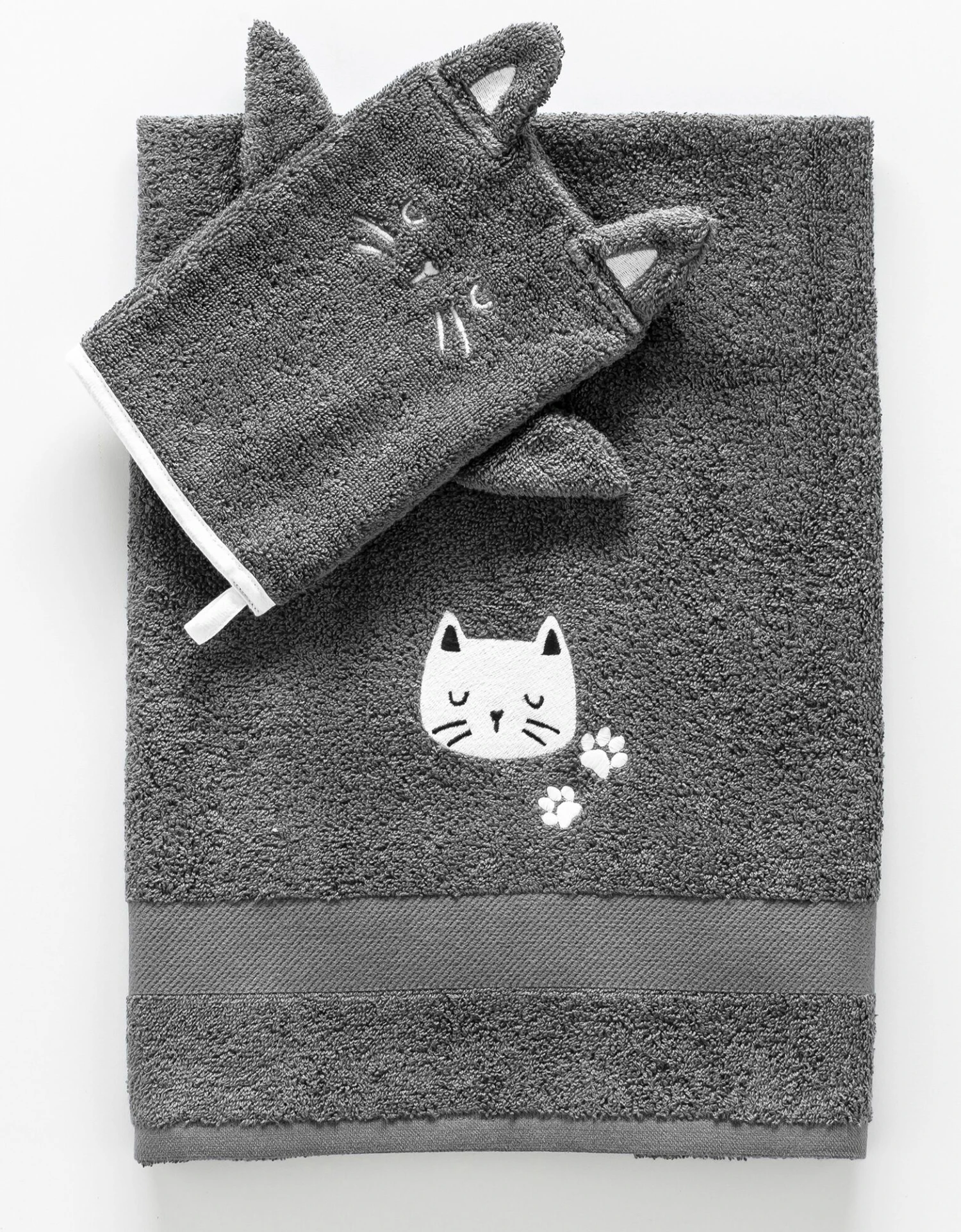 – 1 serviette brodée 50×100 cm + 1 gant de toilette « marionette » 15×21 cm avec oreilles et broderies