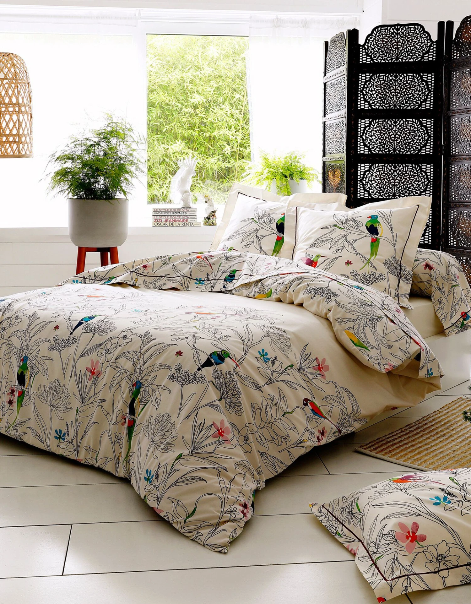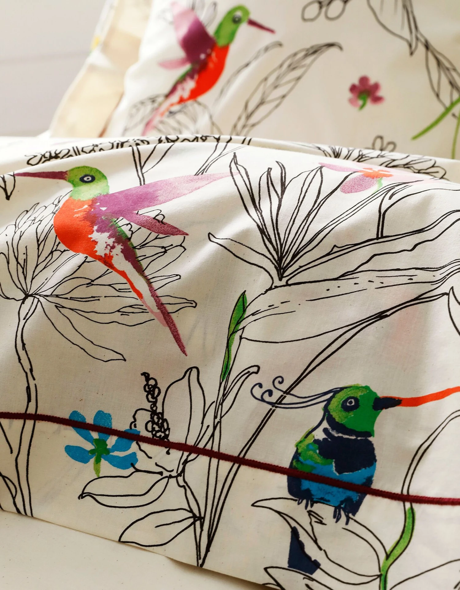 – Taie carrée motif placé, volant plat, finition bourdon, 2 faces identiques. Taie rectangulaire motif continu, volant plat, finition bourdon.