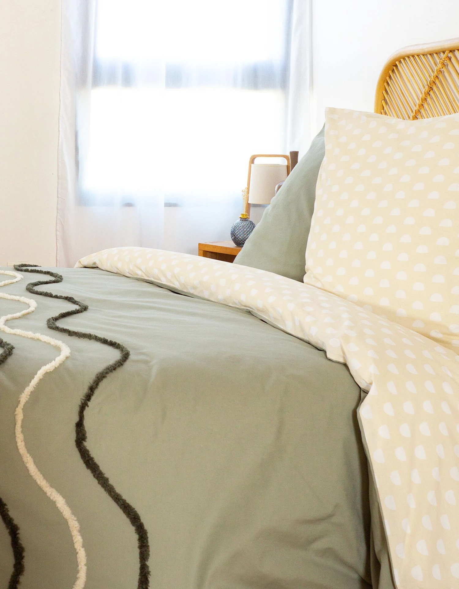 – Housse de couette finiton boutonnée, fentes passe-mains 2 faces différentes : 1 face unie avec ligne de coton tufté reliéfé, 1 face motif continu coordonné